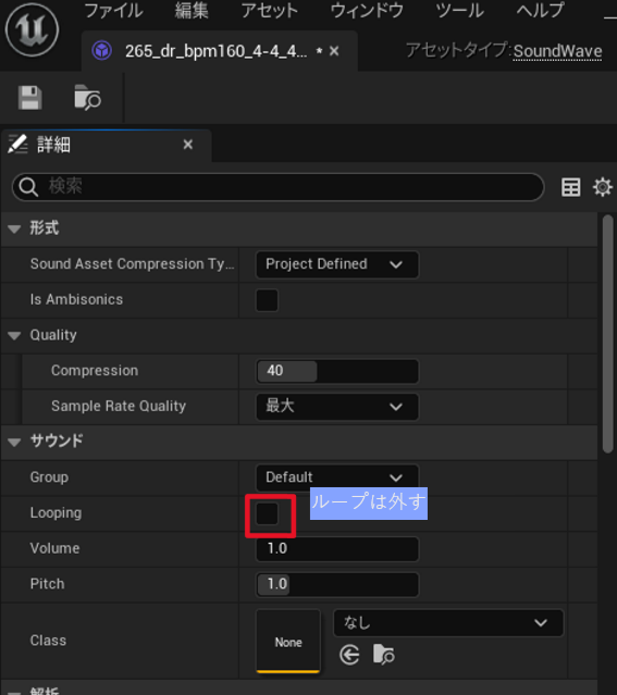 さらにUE上にインポートして、利用するループ用サウンドファイルはWavなりCueなり、ループは切っておく必要があります。 これを忘れていると、ループの繋ぎごと輪唱のように曲がどんどん積み重なってしまいますので注意。
