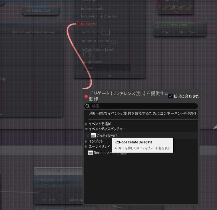 画像ではカスタムイベントに「Event Type」、「Name」といったピンが付いていますが、これは「Play Quantized」ノードの「In Delegate」ピンをドラッグしてCreate Event、イベントディスパッチャーを選択して、一覧から「一致するイベントを作成」で予めピンが用意されたイベントを新規作成することが出来ます。