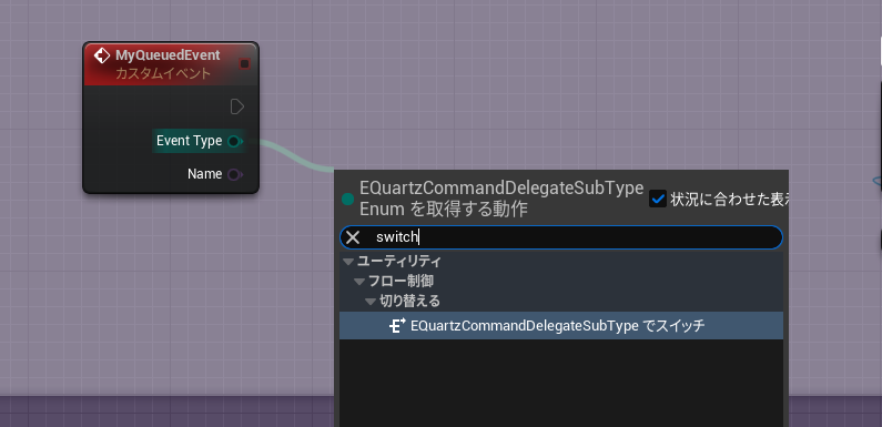 また、「WQuartzCommandDelegateSubTypeでスイッチ」のノードでカスタムイベントの「Event Type」から分岐させます。