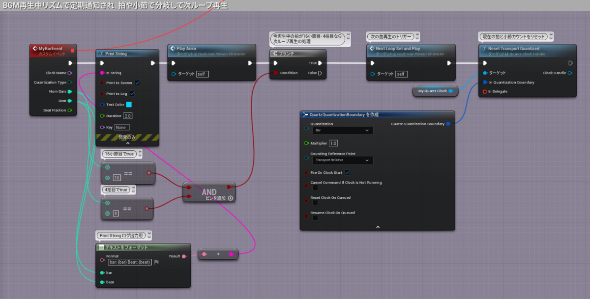 画像ではデバッグ用にPrintStringへ「テキストをフォーマット」というノードで拍や拍子を統合して表示させています。 Format欄のテキストボックスに以下文字列を打ち込むと「Bar」「Beat」のピンが追加されます。