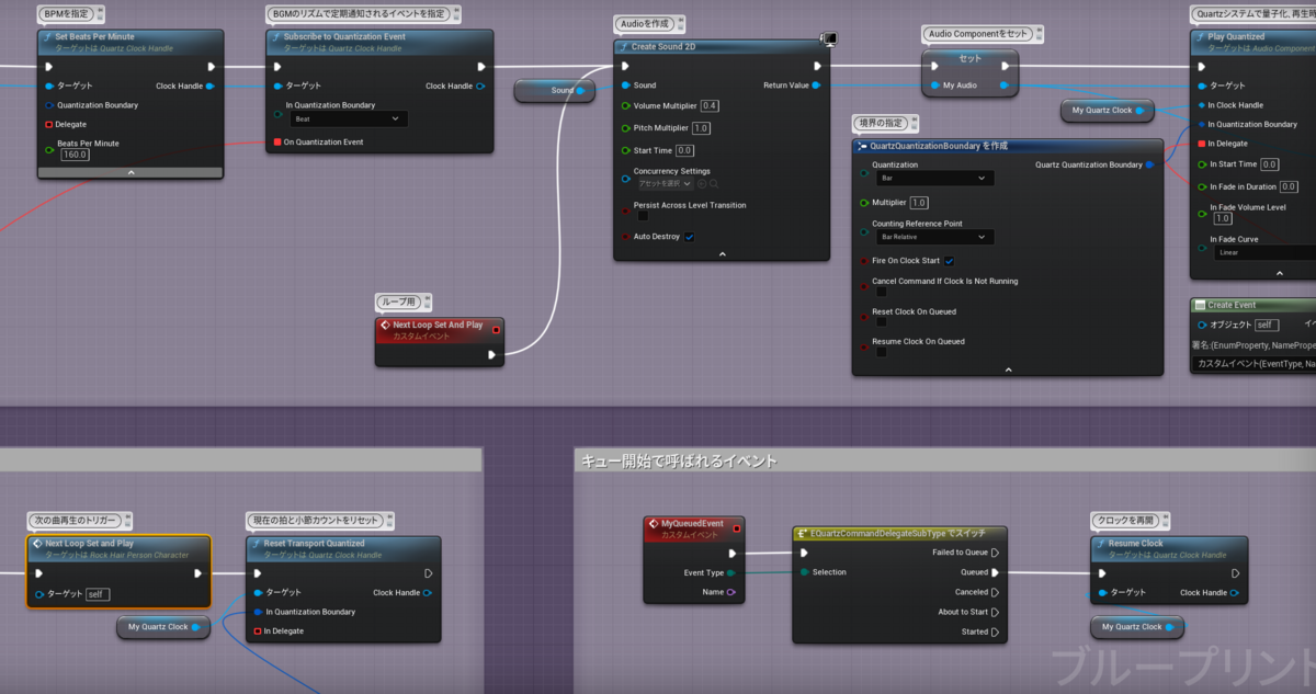 blueprintUEはコピペ可能なようですが当然ながらコピペする場合、イベントや変数を作成し直す必要があります。また、変数にセットされているサウンドファイルや拍子、BPMといった数値は曲に合わせて差し替える必要があります。